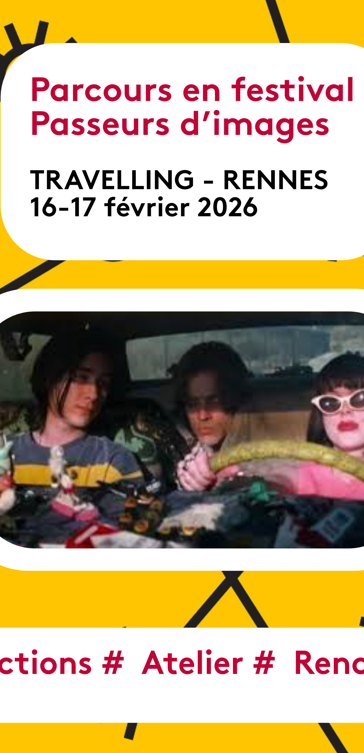 La coordination régionale du dispositif Passeur d’images invite les structures du dispositif et structures jeunesse à accompagner leurs jeunes pour deux jours au festival Travelling de Rennes. Un parcours, c’est s’immerger dans l’ambiance d’un festival, voir des films, rencontrer des professionnel*les du cinéma, rencontrer d’autres jeunes, participer à un/ des ateliers. Le programme est constitué en fonction des âges du groupe et de la grille programme du festival.